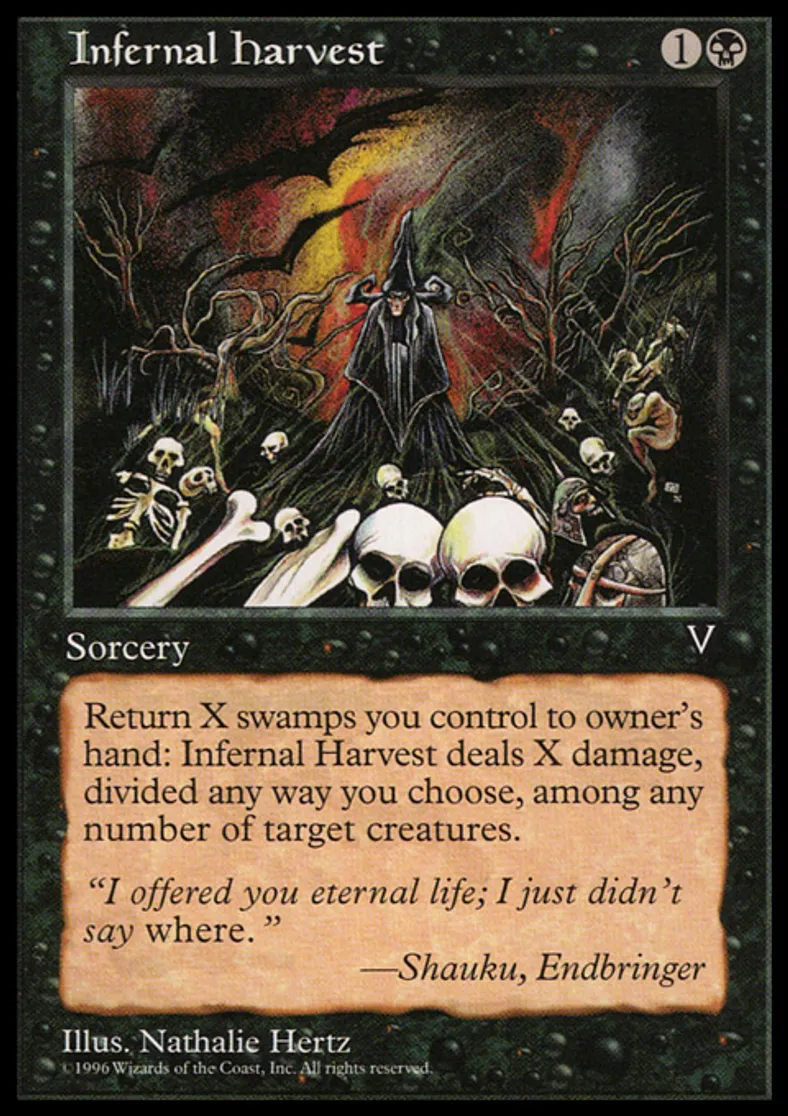 | Oracle Text | As an additional cost to cast Infernal Harvest, return X Swamps you control to their owner's hand. Infernal Harvest deals X damage divided as you choose among any number of target creatures. | ||