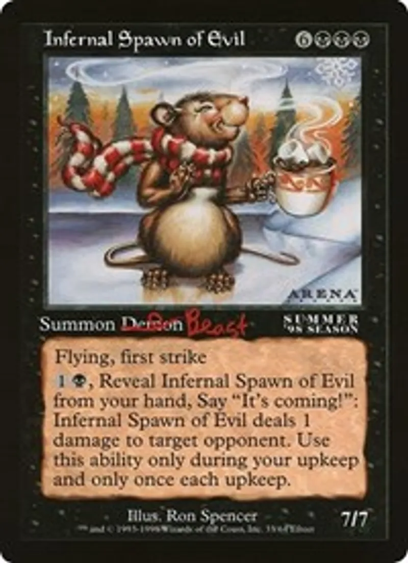 {{1}}{{b}}, Reveal Infernal Spawn of Evil from your hand, Say “It’s coming!”: Infernal Spawn of Evil deals 1 damage to target opponent. Use this ability only during your upkeep and only once each upkeep. | ||