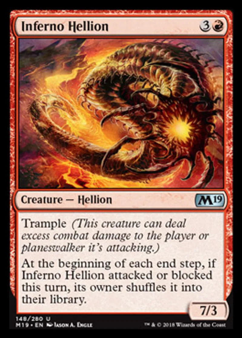 | Oracle Text | Trample (This creature can deal excess combat damage to the player or planeswalker it's attacking.) At the beginning of each end step, if Inferno Hellion attacked or blocked this turn, its owner shuffles it into their library. | ||