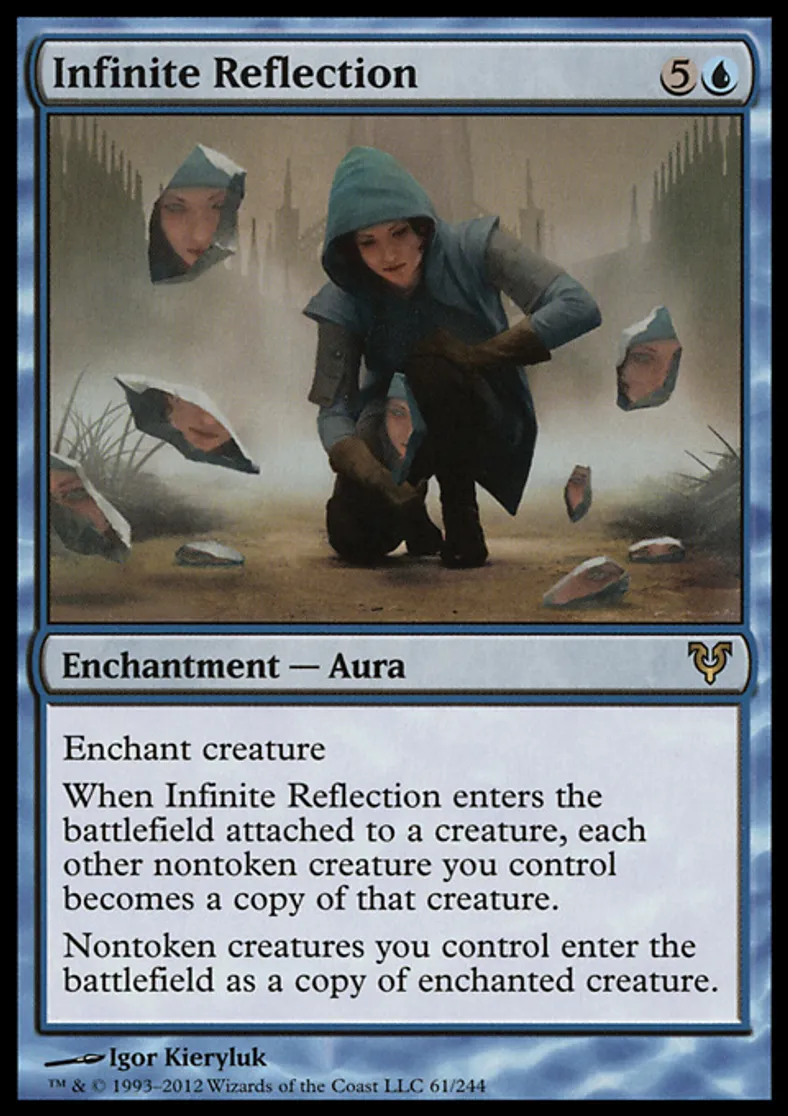 | Oracle Text | Enchant creature When Infinite Reflection enters the battlefield attached to a creature, each other nontoken creature you control becomes a copy of that creature. Nontoken creatures you control enter the battlefield as a copy of enchanted creature. | ||