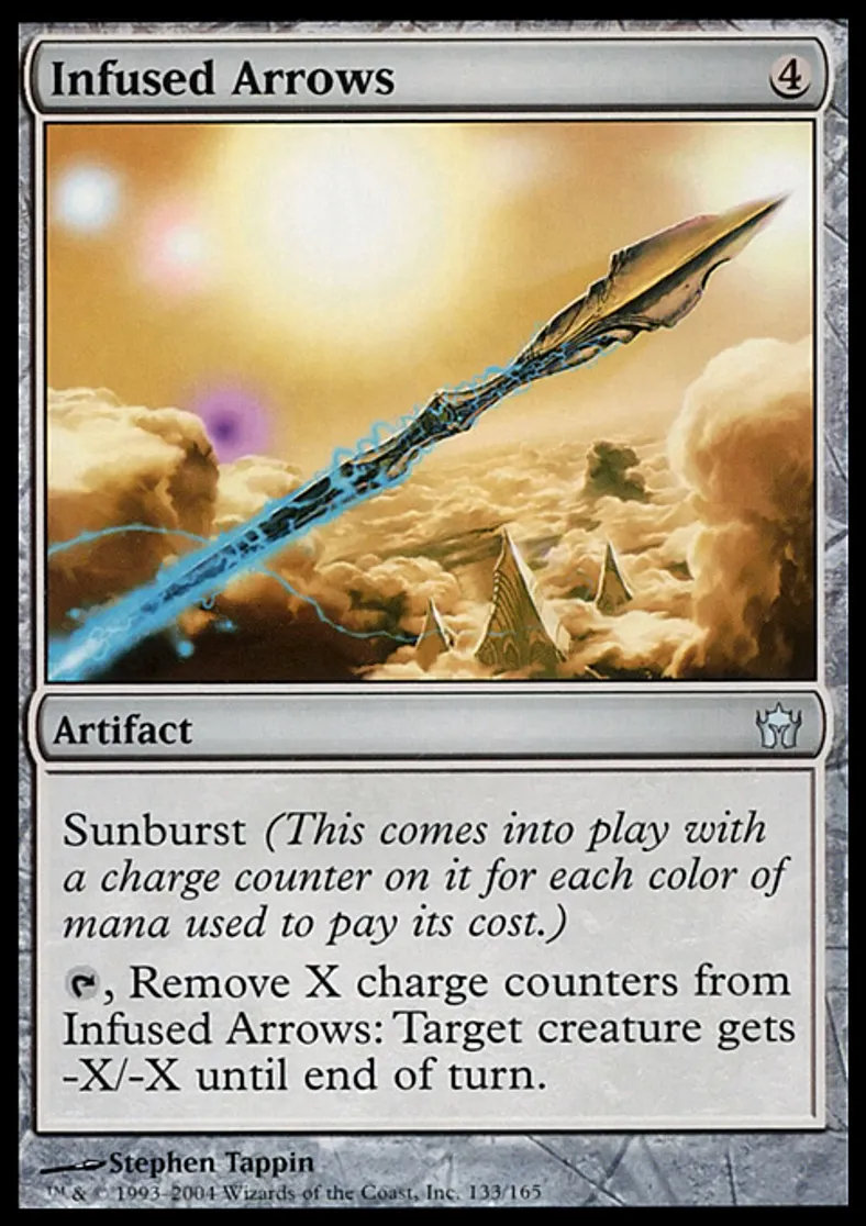 | Oracle Text | Sunburst (This enters the battlefield with a charge counter on it for each color of mana spent to cast it.) {{t}}, Remove X charge counters from Infused Arrows: Target creature gets -X/-X until end of turn. | ||
