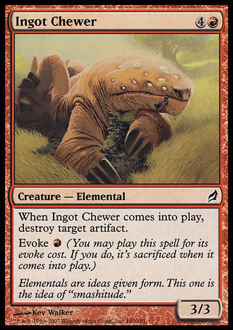 | Oracle Text | When Ingot Chewer enters the battlefield, destroy target artifact. Evoke {{r}} (You may cast this spell for its evoke cost. If you do, it's sacrificed when it enters the battlefield.) | ||