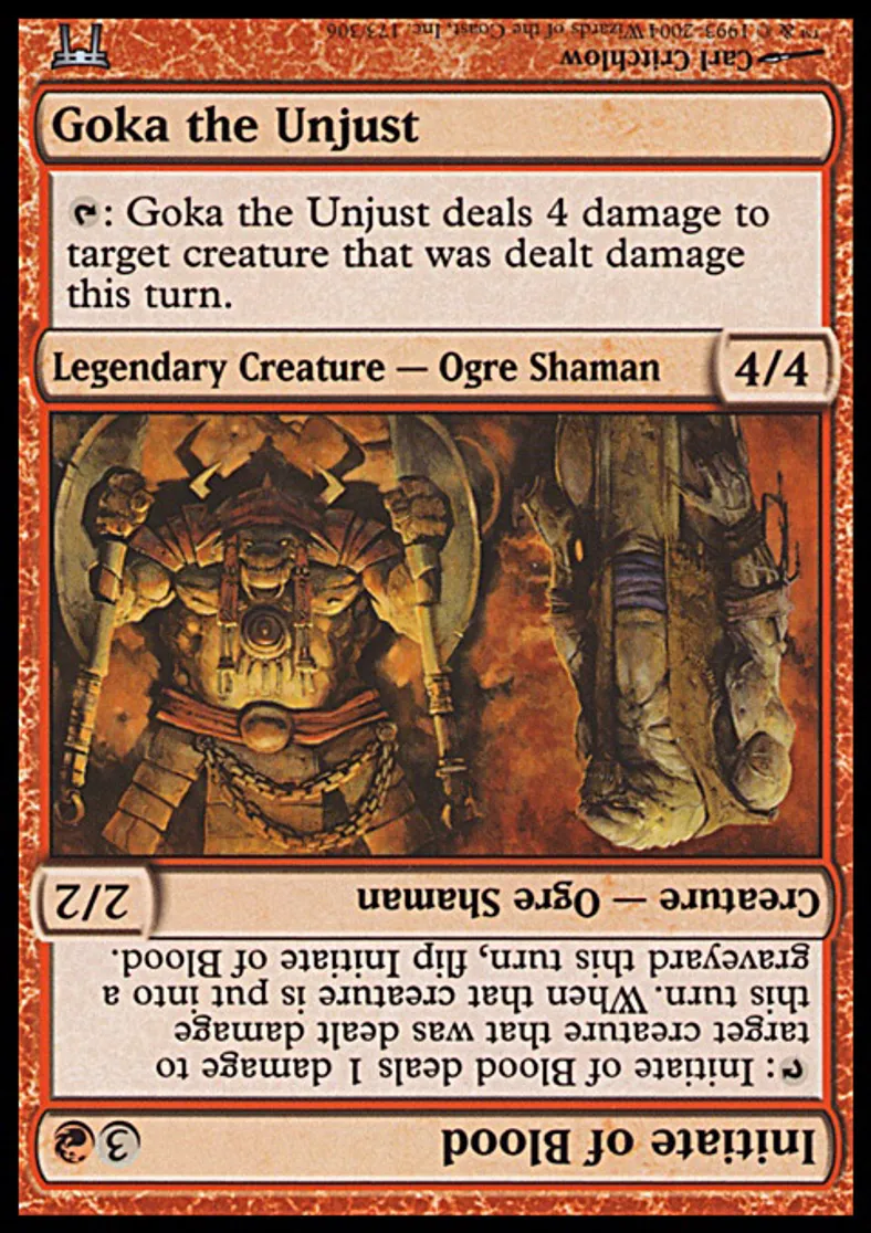 | Oracle Text | {{t}}: Goka the Unjust deals 4 damage to target creature that was dealt damage this turn. | ||