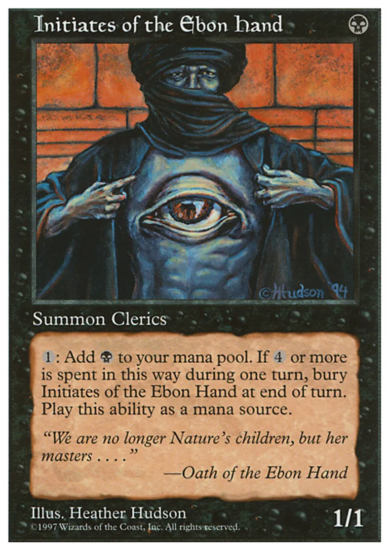 | Oracle Text | {{1}}: Add {{b}} to your mana pool. If this ability has been activated four or more times this turn, sacrifice Initiates of the Ebon Hand at the beginning of the next end step. | ||
