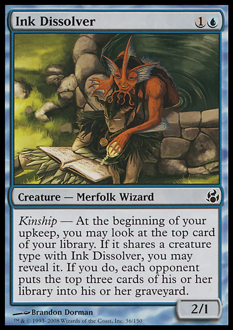 | Oracle Text | Kinship — At the beginning of your upkeep, you may look at the top card of your library. If it shares a creature type with Ink Dissolver, you may reveal it. If you do, each opponent puts the top three cards of his or her library into his or her graveyard. | ||