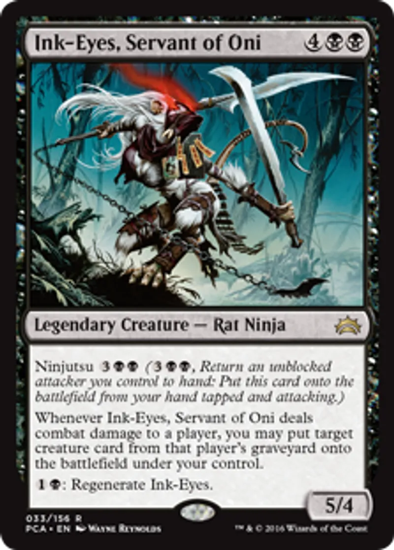 | Oracle Text | Ninjutsu {{3}}{{b}}{{b}} ({{3}}{{b}}{{b}}, Return an unblocked attacker you control to hand: Put this card onto the battlefield from your hand tapped and attacking.) Whenever Ink-Eyes, Servant of Oni deals combat damage to a player, you may put target creature card from that player's graveyard onto the battlefield under your control. {{1}}{{b}}: Regenerate Ink-Eyes. | ||