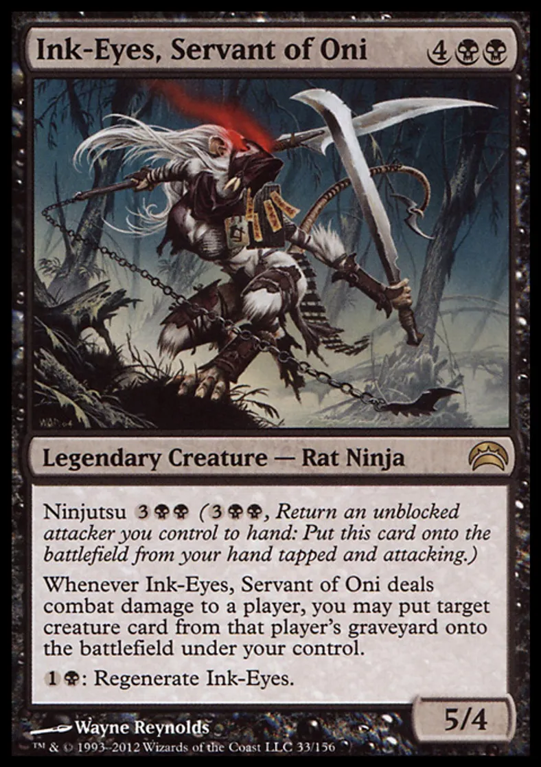 | Oracle Text | Ninjutsu {{3}}{{b}}{{b}} ({{3}}{{b}}{{b}}, Return an unblocked attacker you control to hand: Put this card onto the battlefield from your hand tapped and attacking.) Whenever Ink-Eyes, Servant of Oni deals combat damage to a player, you may put target creature card from that player's graveyard onto the battlefield under your control. {{1}}{{b}}: Regenerate Ink-Eyes. | ||