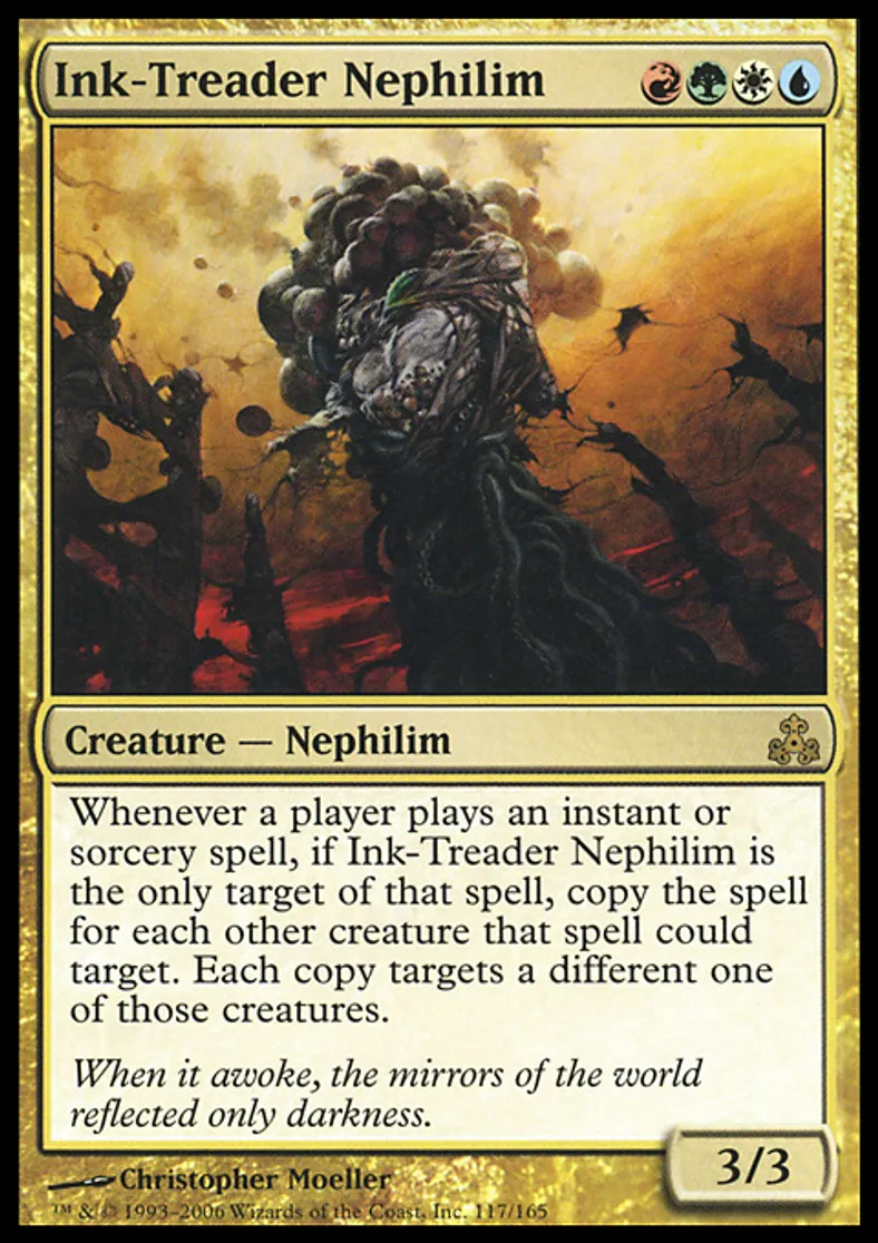 | Oracle Text | Whenever a player casts an instant or sorcery spell, if Ink-Treader Nephilim is the only target of that spell, copy the spell for each other creature that spell could target. Each copy targets a different one of those creatures. | ||