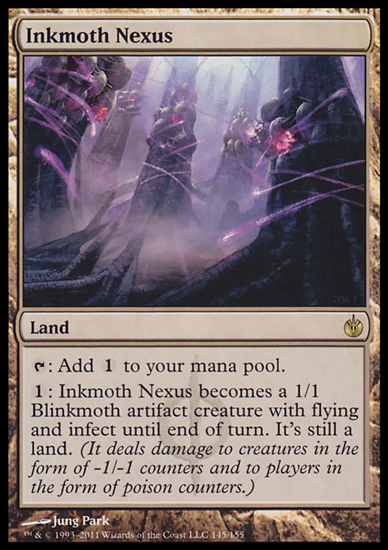 | Oracle Text | {{t}}: Add {{1}} to your mana pool. {{1}}: Inkmoth Nexus becomes a 1/1 Blinkmoth artifact creature with flying and infect until end of turn. It's still a land. (It deals damage to creatures in the form of -1/-1 counters and to players in the form of poison counters.) | ||