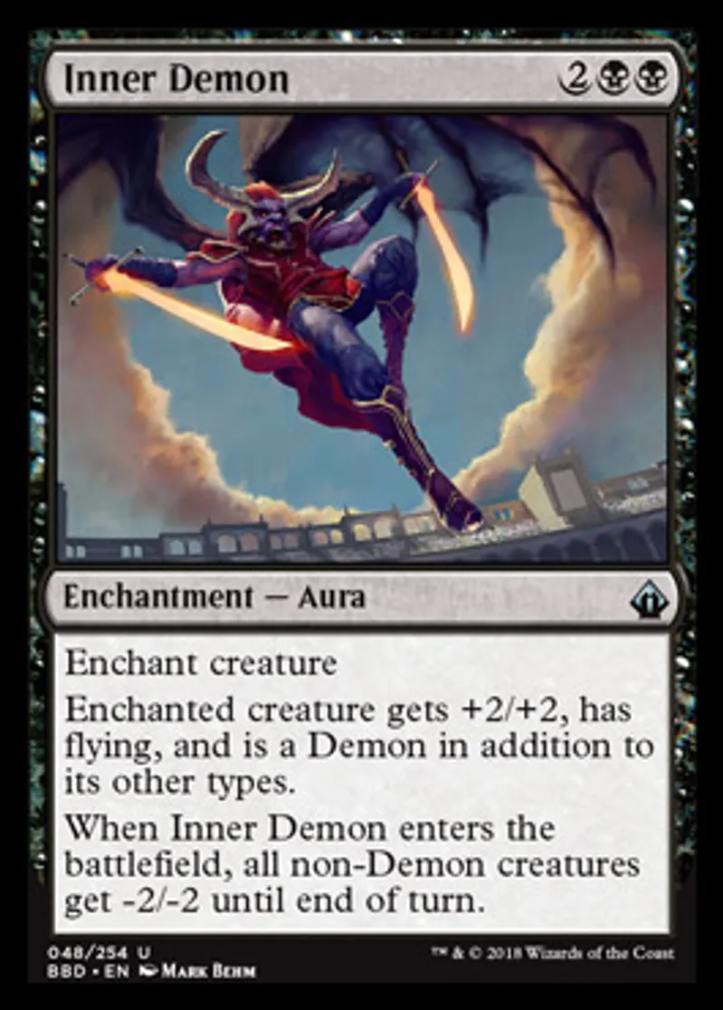 | Oracle Text | Enchant creature Enchanted creature gets +2/+2, has flying, and is a Demon in addition to its other types. When Inner Demon enters the battlefield, all non-Demon creatures get -2/-2 until end of turn. | ||
