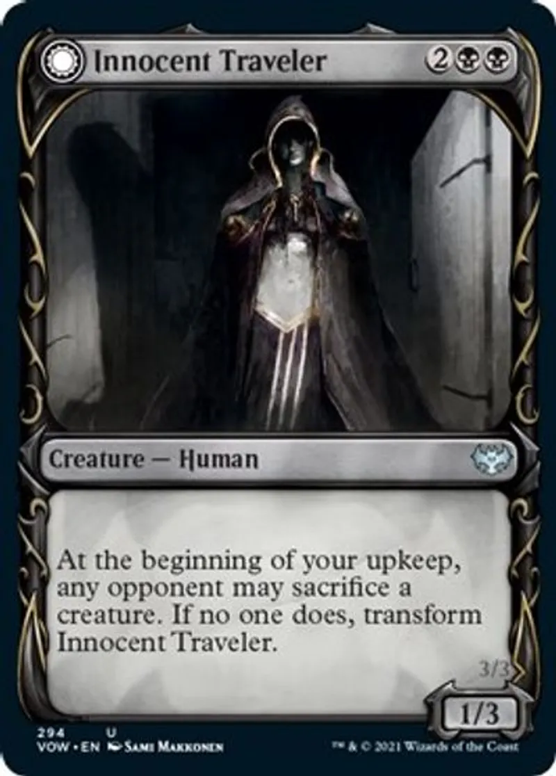 | Oracle Text | At the beginning of your upkeep, any opponent may sacrifice a creature. If no one does, transform Innocent Traveler.