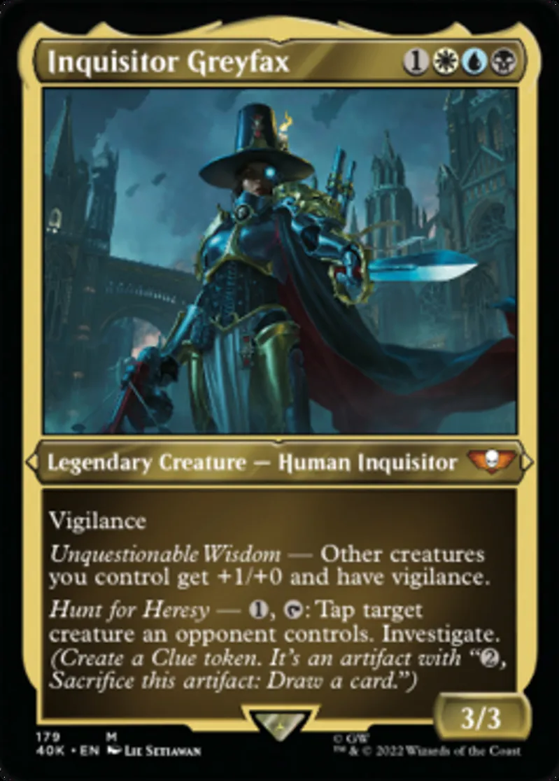 Magic: the Gathering (mtg) Mythic Rare Legendary Creature — Human Inquisitor Inquisitor Greyfax from Warhammer 40,000 Commander (40K) last updated 2026-02-21 16:13:01