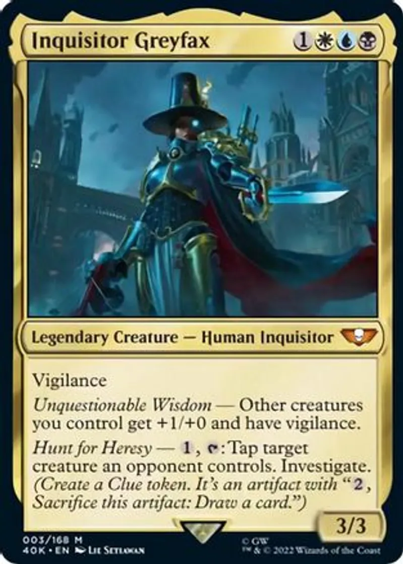 Magic: the Gathering (mtg) Mythic Rare Legendary Creature — Human Inquisitor Inquisitor Greyfax from Warhammer 40,000 (40K) last updated 2026-02-24 15:39:02