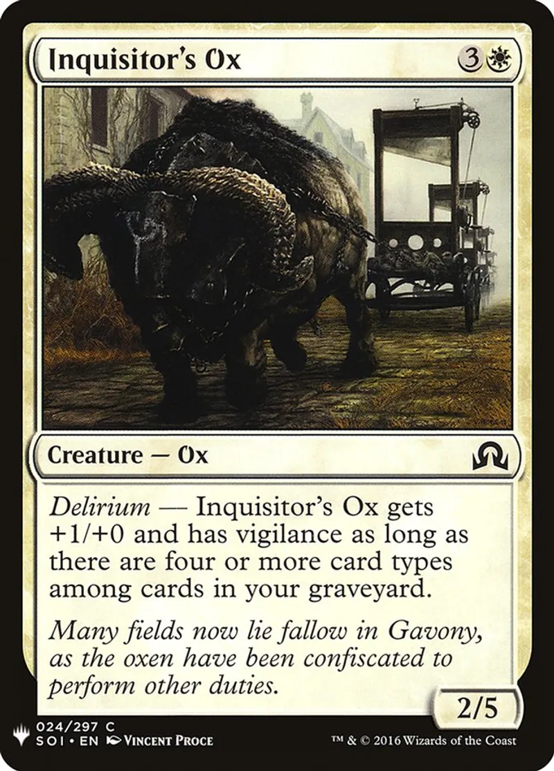 | Oracle Text | Delirium — Inquisitor's Ox gets +1/+0 and has vigilance as long as there are four or more card types among cards in your graveyard. | ||