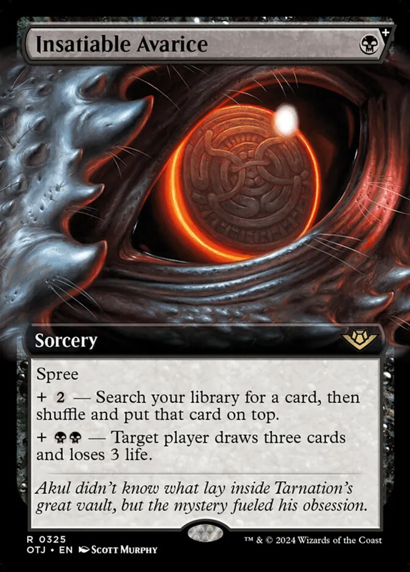 Insatiable Avarice (Extended Art) is a rare in the set Outlaws of Thunder Junction.