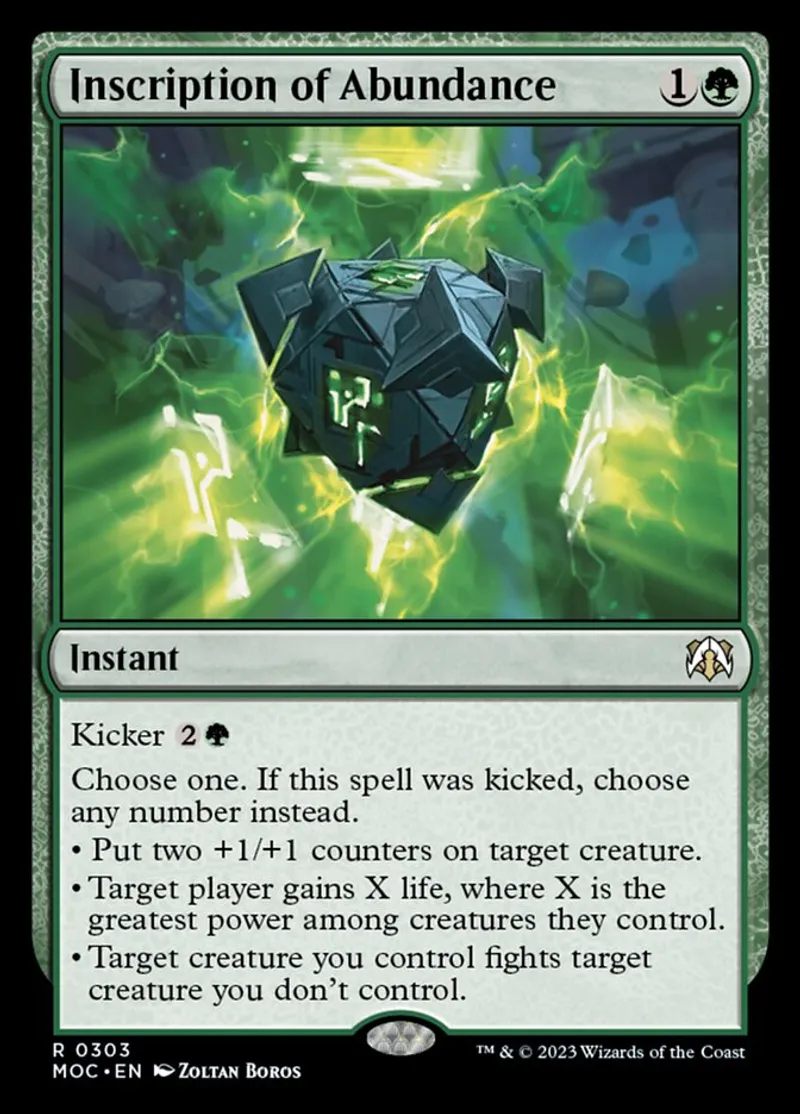 Magic: the Gathering (mtg) rare Instant Inscription of Abundance from March of the Machine Commander (moc) last updated 2026-02-24 15:42:02