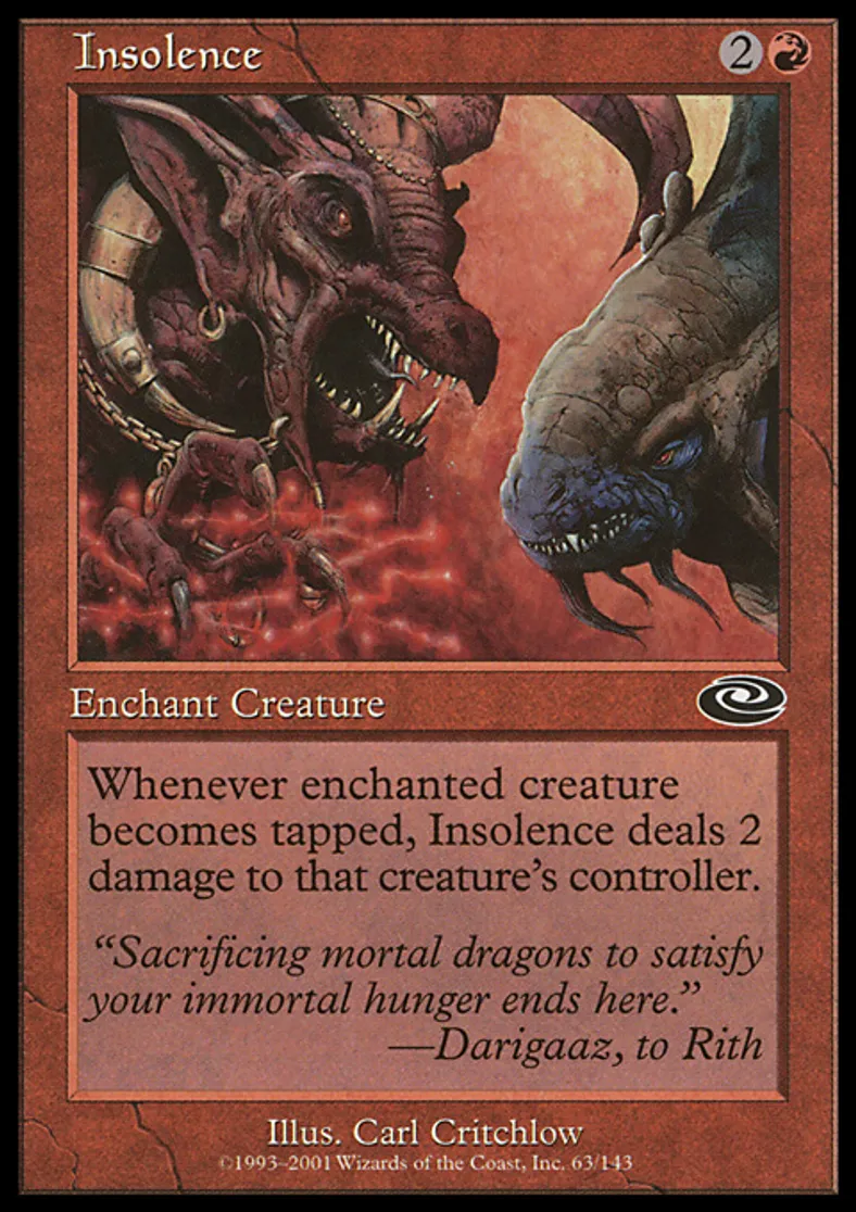 | Oracle Text | Enchant creature Whenever enchanted creature becomes tapped, Insolence deals 2 damage to that creature's controller. | ||