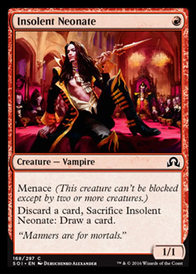 | Oracle Text | Menace (This creature can't be blocked except by two or more creatures.) Discard a card, Sacrifice Insolent Neonate: Draw a card. | ||