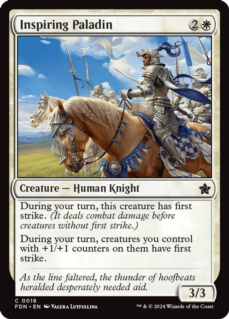 Magic: the Gathering (mtg) Common creature — human knight Inspiring Paladin from Foundations (FDN) last updated 2025-12-20 15:31:02