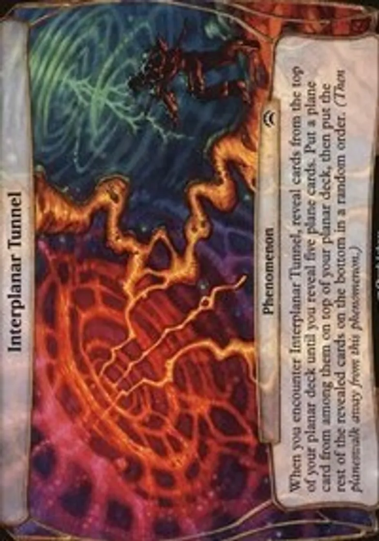 | Oracle Text | When you encounter Interplanar Tunnel, reveal cards from the top of your planar deck until you reveal five plane cards. Put a plane card from among them on top of your planar deck, then put the rest of the revealed cards on the bottom in a random order. (Then planeswalk away from this phenomenon.) | ||