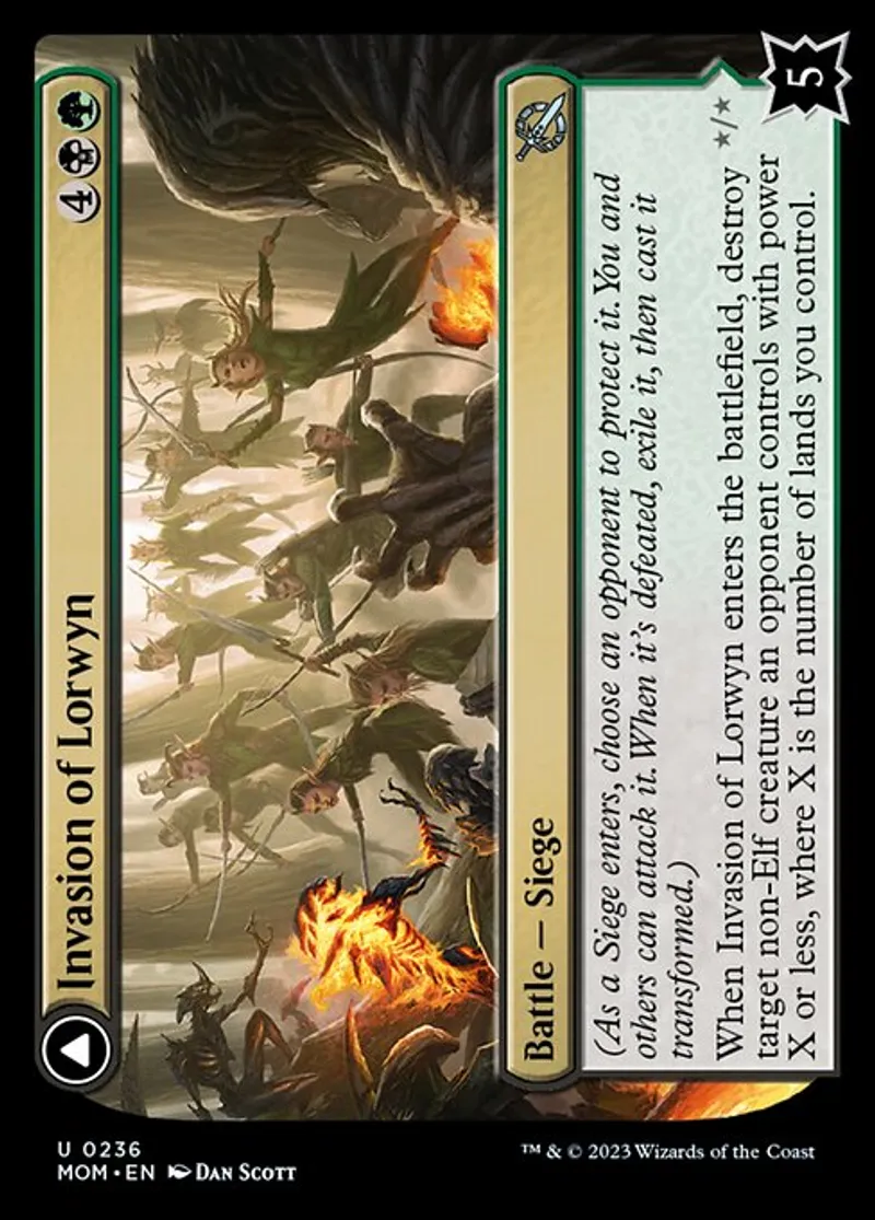 Magic: the Gathering (mtg) Uncommon Battle — Siege // Creature — Elf Warrior Invasion of Lorwyn from March of the Machine (mom) last updated 2026-02-21 16:22:32