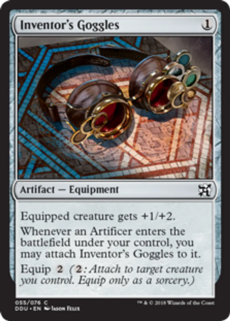 | Oracle Text | Equipped creature gets +1/+2. Whenever an Artificer enters the battlefield under your control, you may attach Inventor's Goggles to it. Equip {{2}} ({{2}}: Attach to target creature you control. Equip only as a sorcery.) | ||
