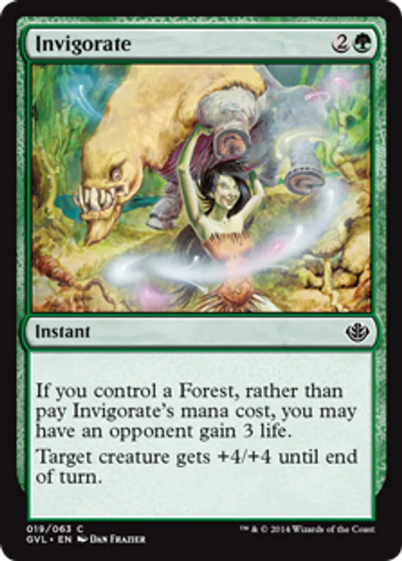 | Oracle Text | If you control a Forest, rather than pay Invigorate's mana cost, you may have an opponent gain 3 life. Target creature gets +4/+4 until end of turn. | ||