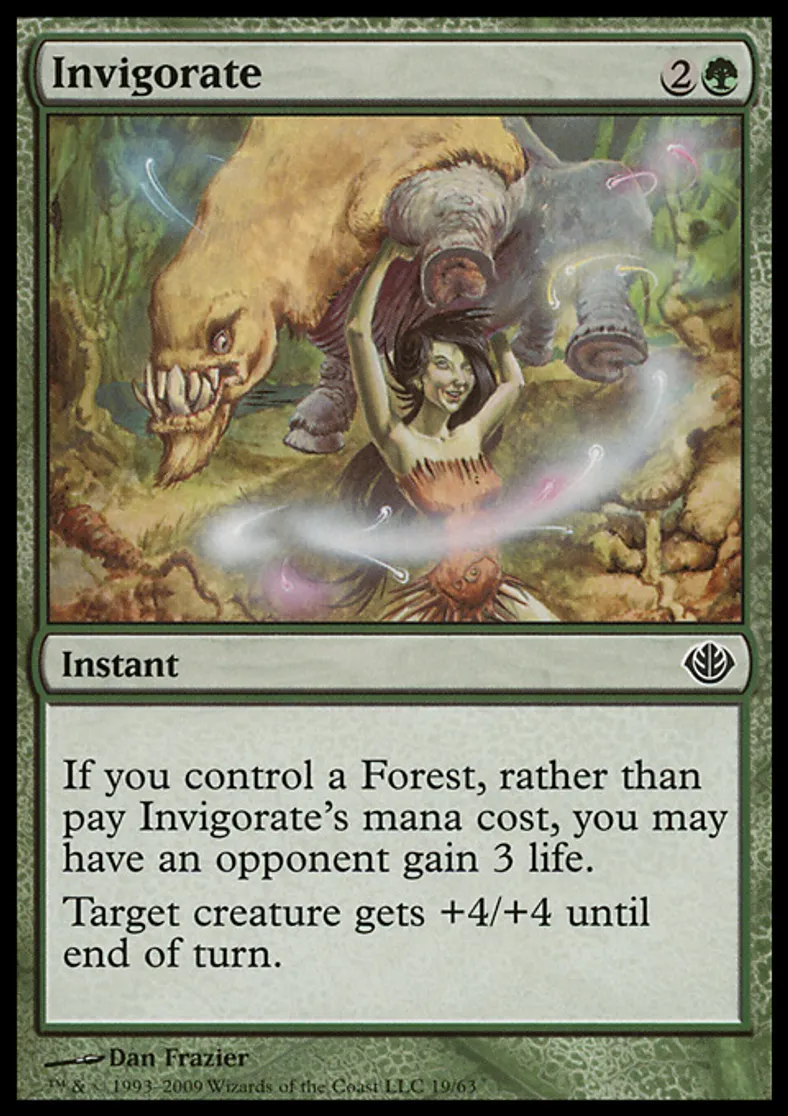 | Oracle Text | If you control a Forest, rather than pay Invigorate's mana cost, you may have an opponent gain 3 life. Target creature gets +4/+4 until end of turn. | ||