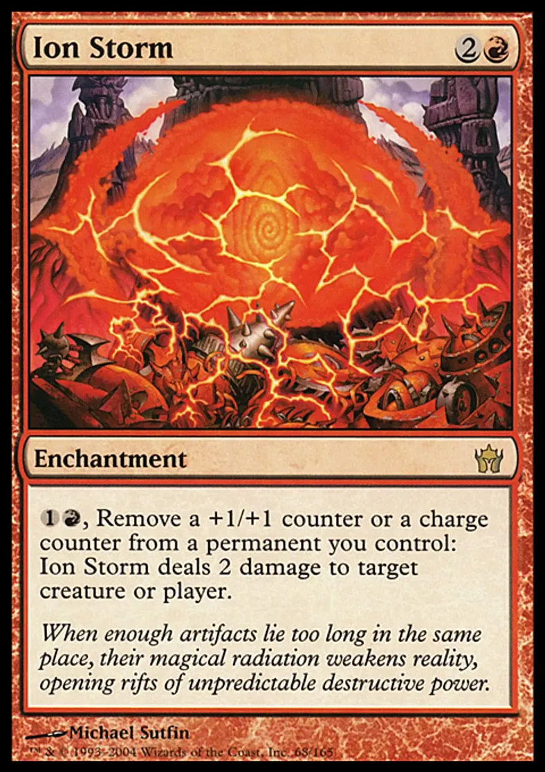 | Oracle Text | {{1}}{{r}}, Remove a +1/+1 counter or a charge counter from a permanent you control: Ion Storm deals 2 damage to target creature or player. | ||