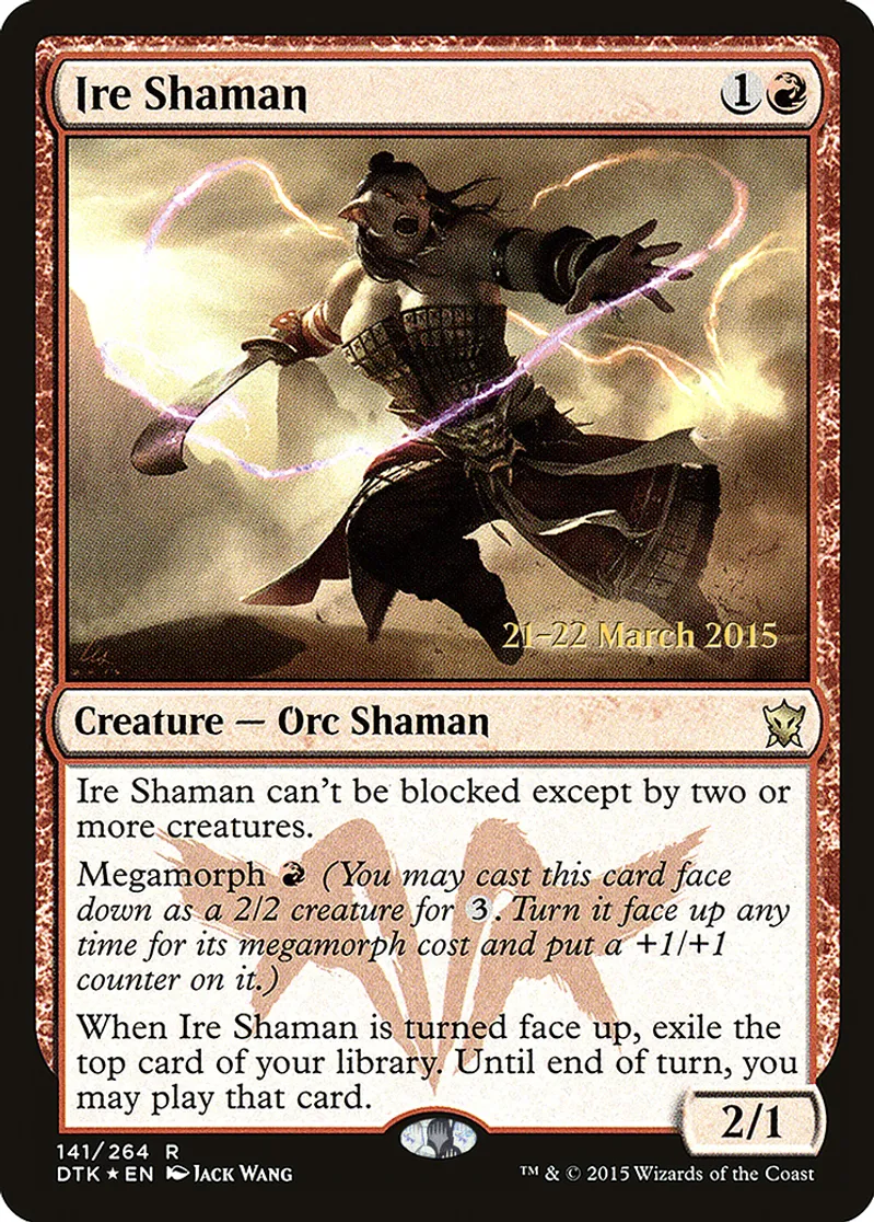 | Oracle Text | Menace (This creature can\'t be blocked except by two or more creatures.)\r\nMegamorph {{r}} (You may cast this card face down as a 2/2 creature for {{3}}. Turn it face up any time for its megamorph cost and put a +1/+1 counter on it.)\r\nWhen Ire Shaman is turned face up, exile the top card of your library. Until end of turn, you may play that card. | ||