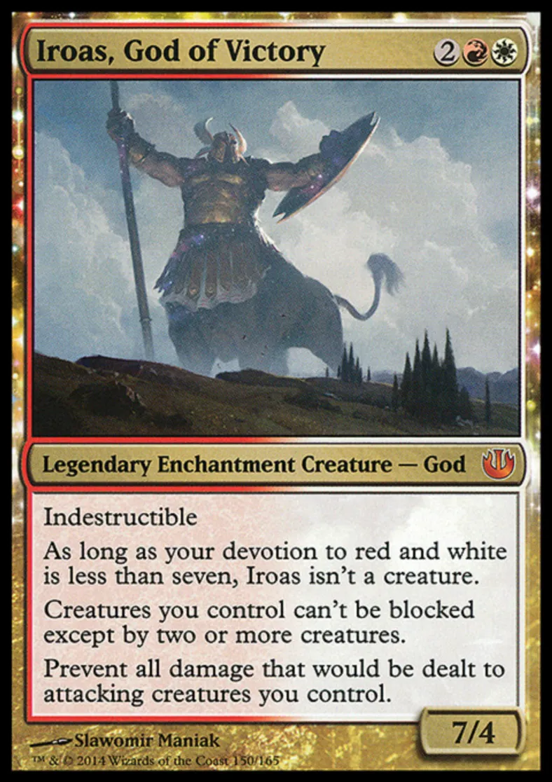 | Oracle Text | Indestructible As long as your devotion to red and white is less than seven, Iroas isn't a creature. Creatures you control can't be blocked except by two or more creatures. Prevent all damage that would be dealt to attacking creatures you control. | ||