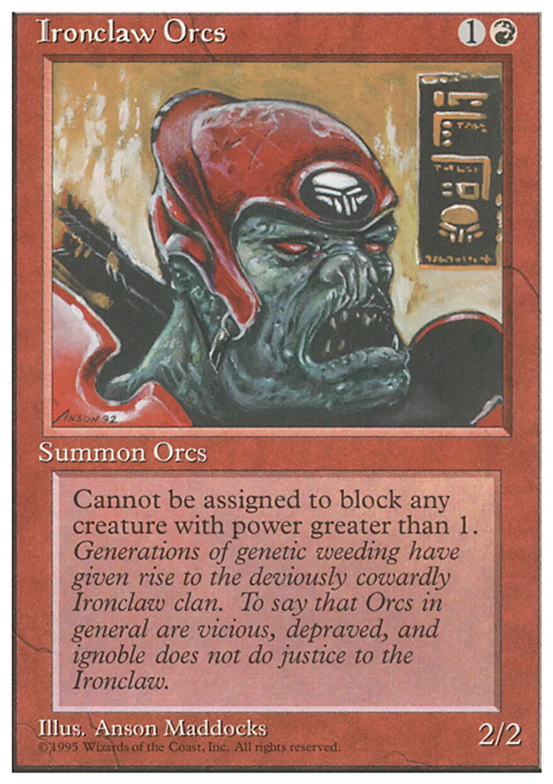 | Oracle Text | Ironclaw Orcs can't block creatures with power 2 or greater. | ||
