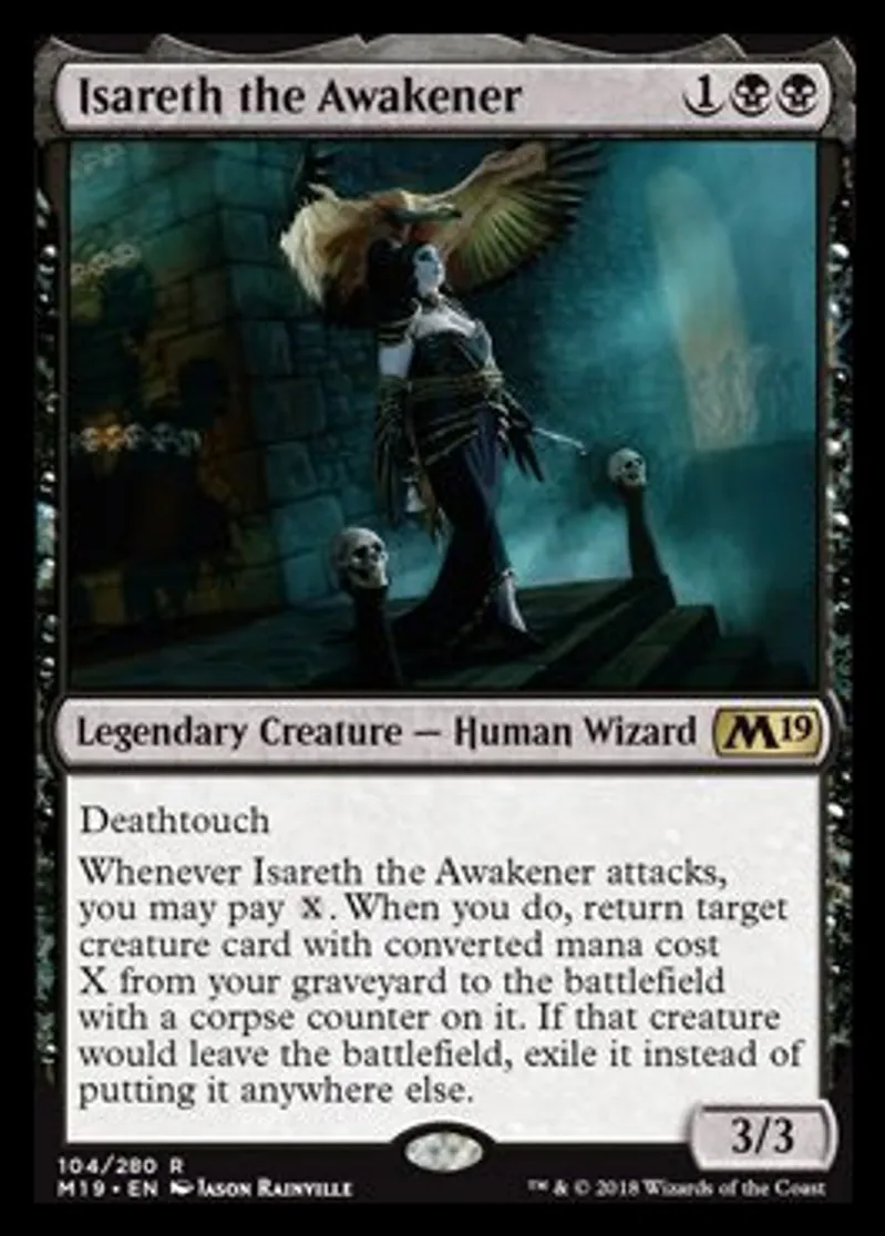 | Oracle Text | Deathtouch Whenever Isareth the Awakener attacks, you may pay {{x}}. When you do, return target creature card with converted mana cost X from your graveyard to the battlefield with a corpse counter on it. If that creature would leave the battlefield, exile it instead of putting it anywhere else. | ||
