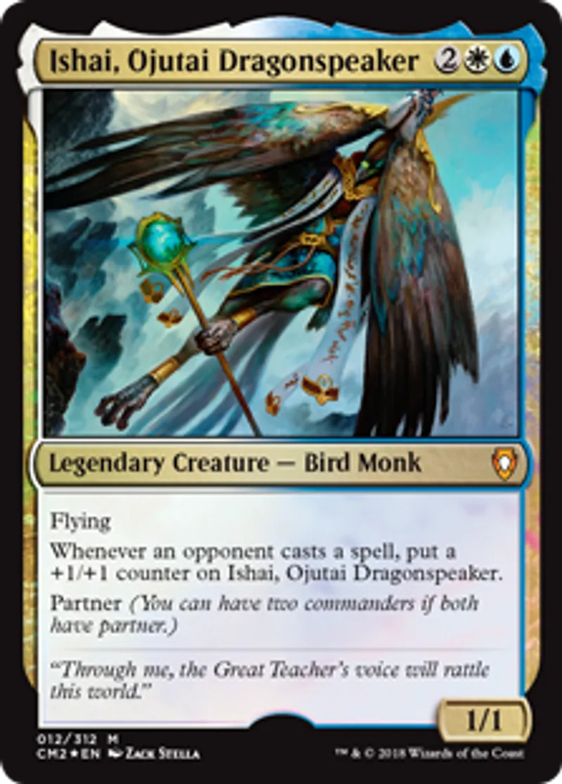 | Oracle Text | Flying Whenever an opponent casts a spell, put a +1/+1 counter on Ishai, Ojutai Dragonspeaker. Partner (You can have two commanders if both have partner.) | ||