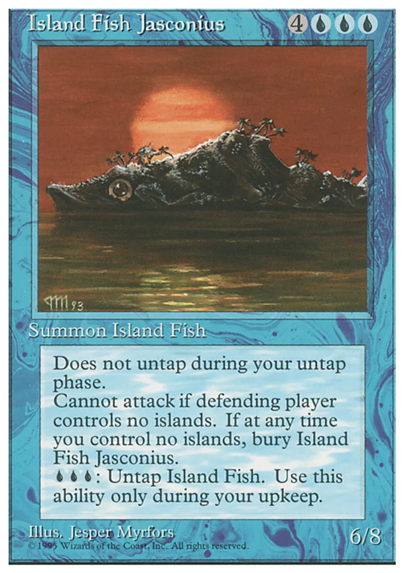 | Oracle Text | Island Fish Jasconius doesn't untap during your untap step. At the beginning of your upkeep, you may pay {{u}}{{u}}{{u}}. If you do, untap Island Fish Jasconius. Island Fish Jasconius can't attack unless defending player controls an Island. When you control no Islands, sacrifice Island Fish Jasconius. | ||
