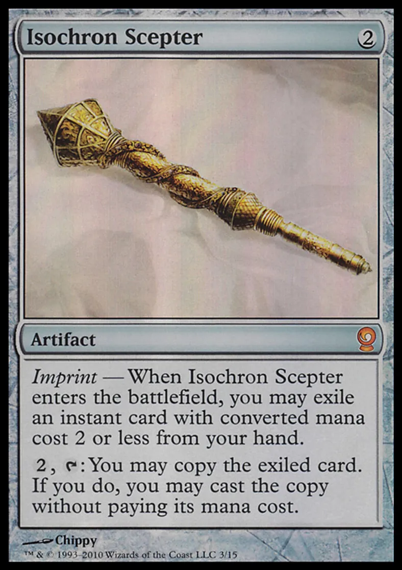 | Oracle Text | Imprint — When Isochron Scepter enters the battlefield, you may exile an instant card with converted mana cost 2 or less from your hand. {{2}}, {{t}}: You may copy the exiled card. If you do, you may cast the copy without paying its mana cost. | ||