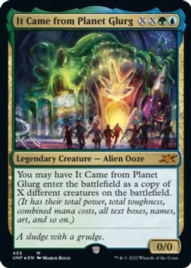 | Oracle Text | You may have It Came from Planet Glurg enter the battlefield as a copy of X different creatures on the battlefield. (It has their total power, total toughness, combined mana costs, all text boxes, names, art, and so on. | ||