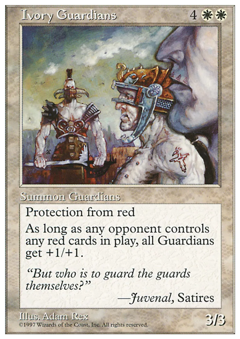 | Oracle Text | Protection from red Creatures named Ivory Guardians get +1/+1 as long as an opponent controls a nontoken red permanent. | ||