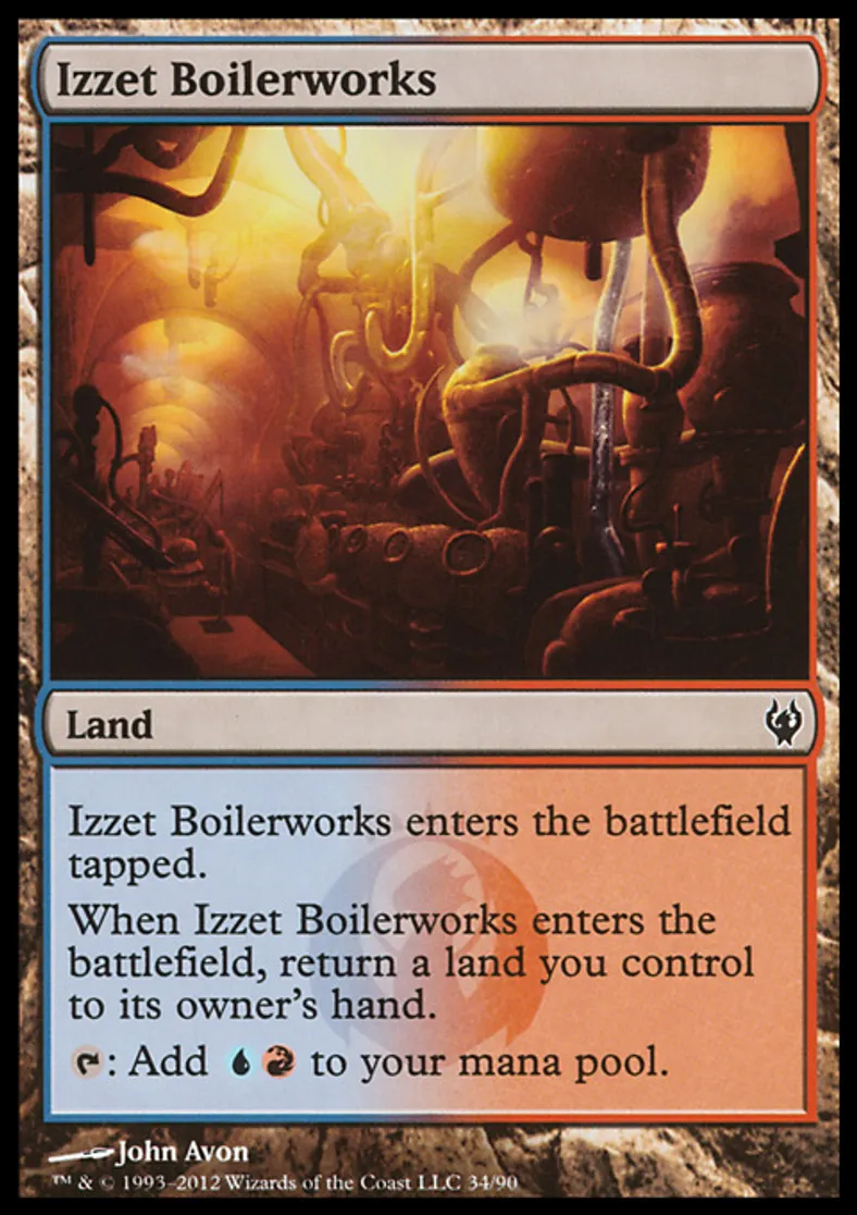 | Oracle Text | Izzet Boilerworks enters the battlefield tapped. When Izzet Boilerworks enters the battlefield, return a land you control to its owner's hand. {{t}}: Add {{u}}{{r}} to your mana pool. | ||