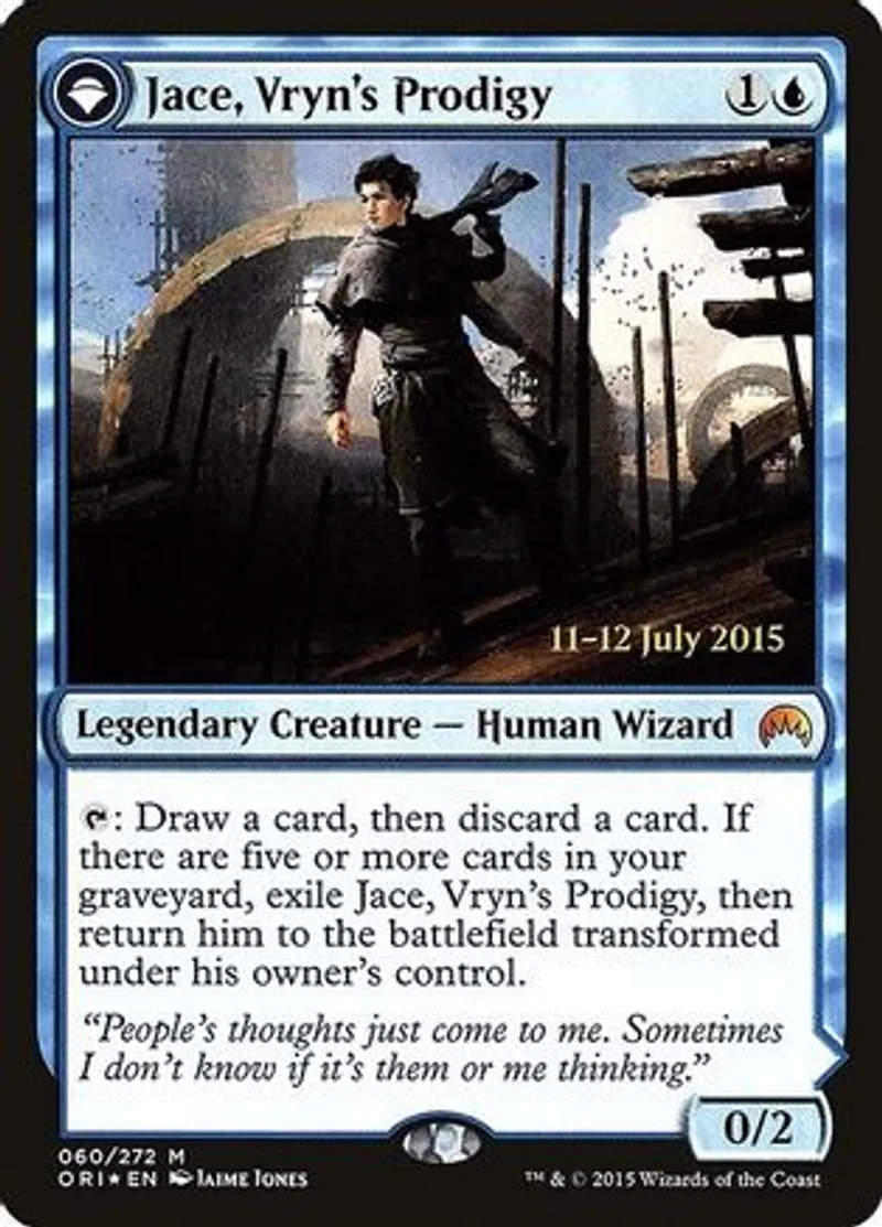| Oracle Text | {{t}}: Draw a card, then discard a card. If there are five or more cards in your graveyard, exile Jace, Vryn's Prodigy, then return him to the battlefield transformed under his owner's control. | ||