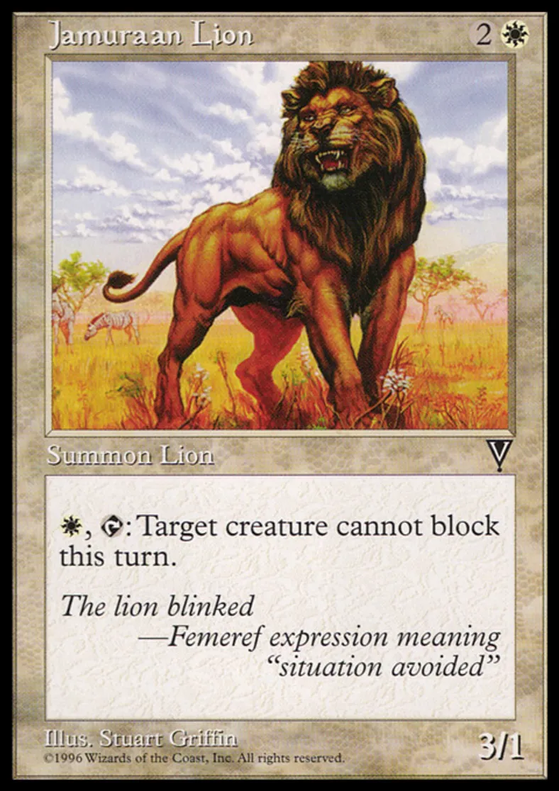 | Flavor Text | The lion blinked—Femeref expression meaning "situation avoided" | ||