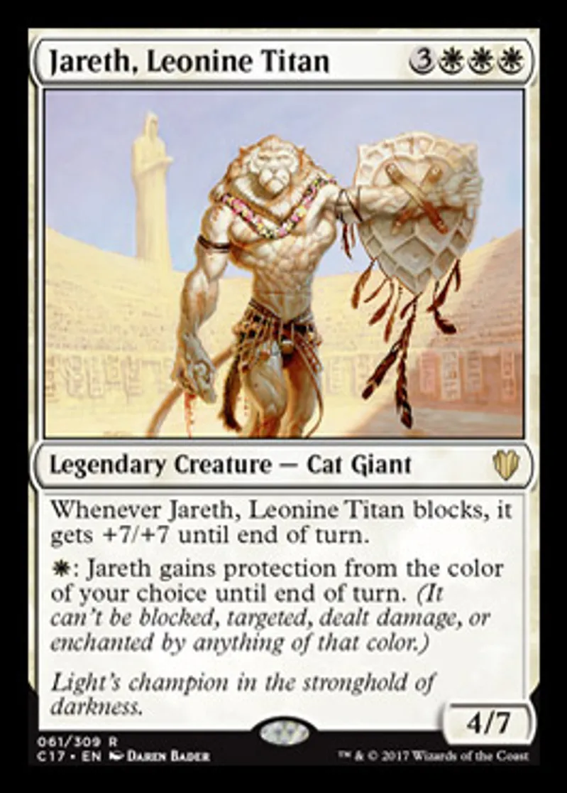 | Oracle Text | Whenever Jareth, Leonine Titan blocks, it gets +7/+7 until end of turn. {{w}}: Jareth gains protection from the color of your choice until end of turn. | ||