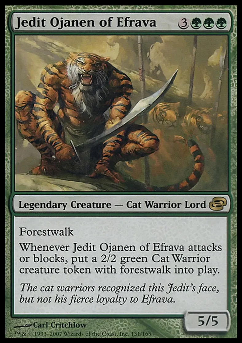 | Oracle Text | Forestwalk Whenever Jedit Ojanen of Efrava attacks or blocks, put a 2/2 green Cat Warrior creature token with forestwalk onto the battlefield. | ||