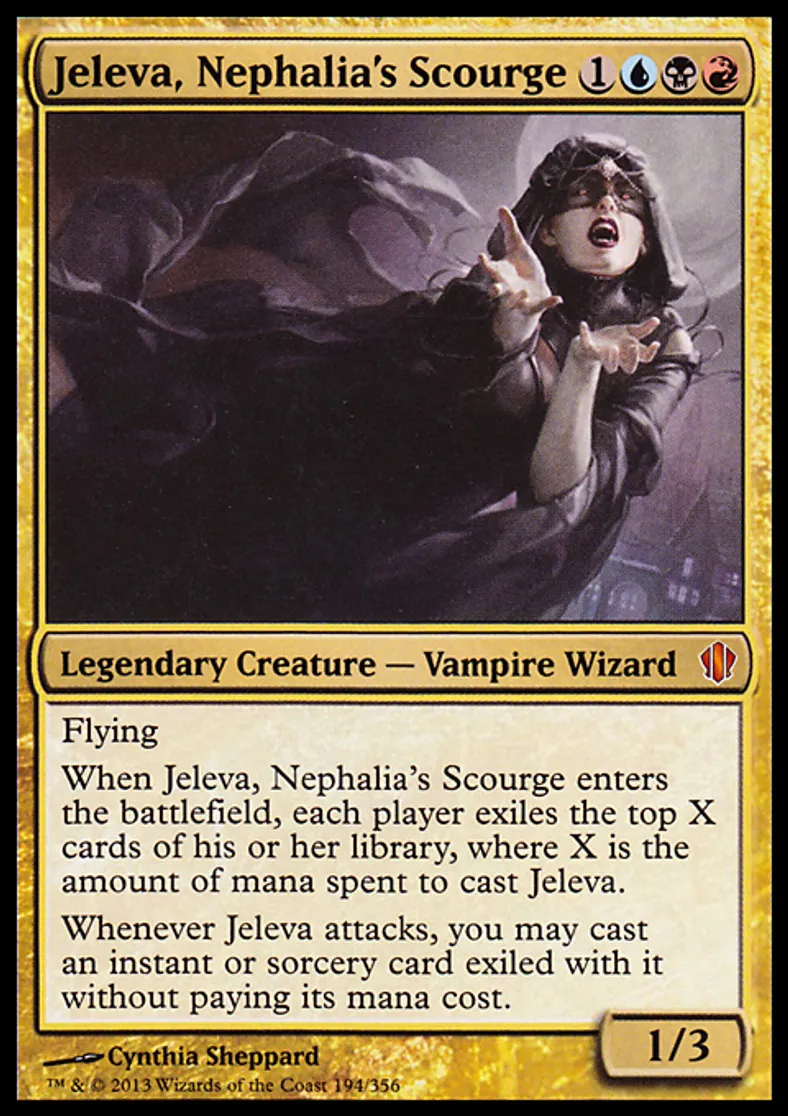 | Oracle Text | Flying When Jeleva, Nephalia's Scourge enters the battlefield, each player exiles the top X cards of his or her library, where X is the amount of mana spent to cast Jeleva. Whenever Jeleva attacks, you may cast an instant or sorcery card exiled with it without paying its mana cost. | ||