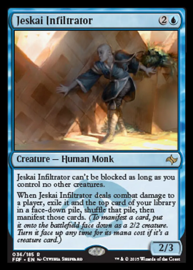 When Jeskai Infiltrator deals combat damage to a player, exile it and the top card of your library in a face-down pile, shuffle that pile, then manifest those cards. (To manifest a card, put it onto the battlefield face down as a 2/2 creature. Turn it face up any time for its mana cost if it's a creature card.) | ||