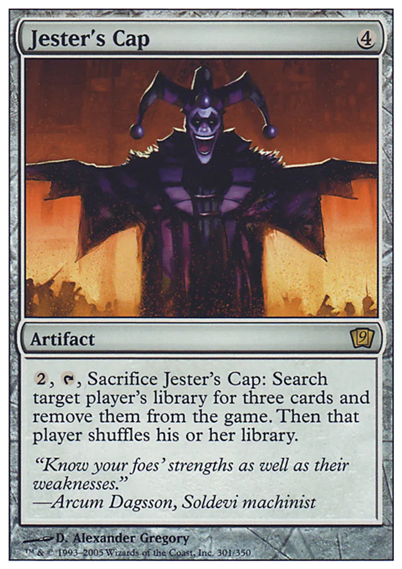 | Oracle Text | {{2}}, {{t}}, Sacrifice Jester's Cap: Search target player's library for three cards and exile them. Then that player shuffles his or her library. | ||