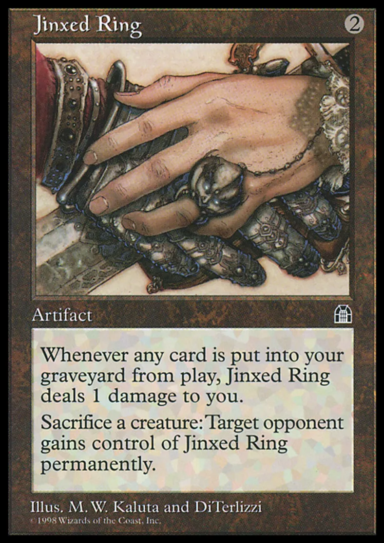 | Oracle Text | Whenever a nontoken permanent is put into your graveyard from the battlefield, Jinxed Ring deals 1 damage to you. Sacrifice a creature: Target opponent gains control of Jinxed Ring. (This effect lasts indefinitely.) | ||