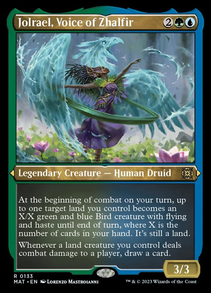 Magic: the Gathering (mtg) Rare Legendary Creature — Human Druid Jolrael, Voice of Zhalfir from March of the Machine: The Aftermath (mat) last updated 2026-02-21 15:41:02