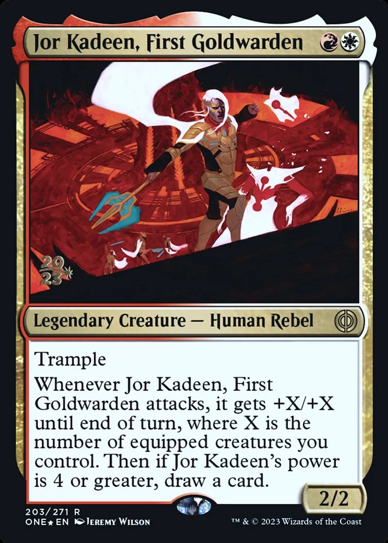 Whenever Jor Kadeen, First Goldwarden attacks, it gets +X/+X until end of turn, where X is the number of equipped creatures you control. Then if Jor Kadeen's power is 4 or greater, draw a card. | ||