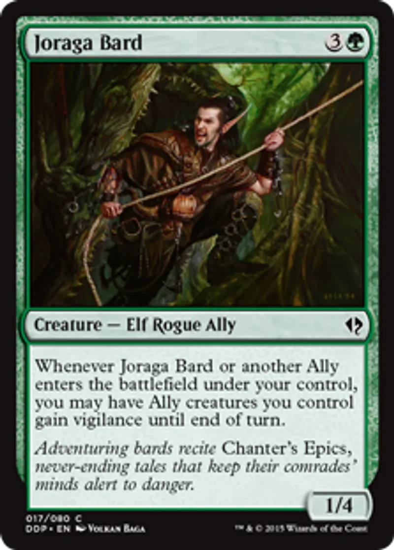 | Oracle Text | Whenever Joraga Bard or another Ally enters the battlefield under your control, you may have Ally creatures you control gain vigilance until end of turn. | ||